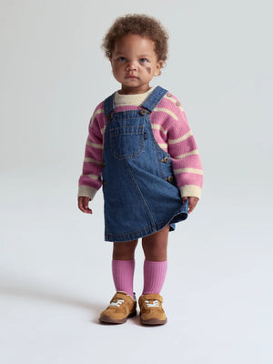 Dungaree dress in soft, lightweight denim – a true autumn favourite! The dress features adjustable straps with buckles at the front and side buttons for easy dressing. It also has a front chest pocket.