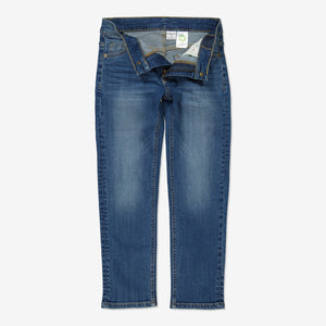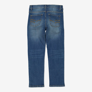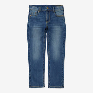 A modern regular fit kid's jeans with room to move in, classic mid blue denim with stretch for all-day comfort.