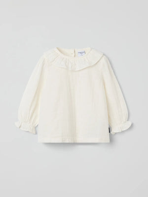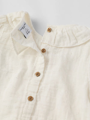 Top in lightweight muslin made from 100% organic cotton for baby. The top features a gathered hem and a collar in soft lace. The sleeve cuffs are elastic and decorated with a sweet ruffle.