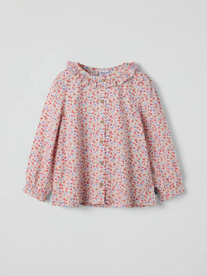 Blouse in thin muslin made from 100% organic cotton. This blouse features a gathered hem and sweet ruffles at the neckline and sleeve cuffs. It closes with buttons at the front.