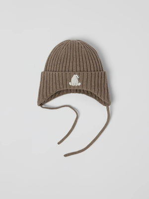 Ribbed knit hat in a soft and warm wool–cotton blend. The hat features a folded edge with a small, cute appliqué at the centre front. It extends slightly over the ears for extra warmth and a comfortable fit. Tie strings help keep it securely in place.