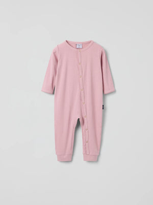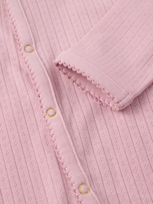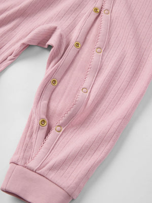 Sleepsuit in soft pointelle fabric of Tencel™ lyocell and organic cotton, sewn with extra soft, flat seams that are gentle on sensitive skin. This overall has straight sleeves and cuffs at the leg ends for a comfortable fit. The long button placket from neck to leg ends makes changing easier.