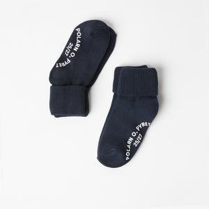 Two-pack navy toddler and baby socks with anti-slip soles, ideal for wooden or laminated floors.These super soft organic cotton kids' socks are gentle on delicate skin, while the anti-slip sole makes them an essential for new walkers and bigger kids alike.