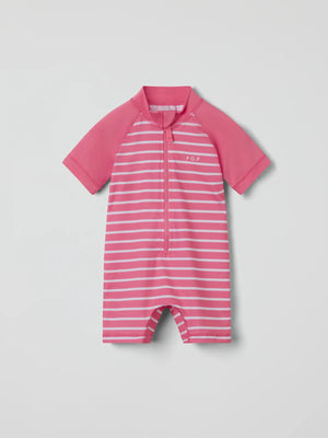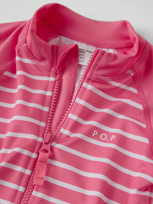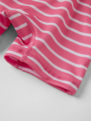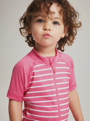 Our iconic striped UV suit with UPF 50 is crafted from soft, comfortable recycled polyester and finished with extra gentle seams for all-day comfort. The front zip makes dressing easy and features a protective flap at the top to prevent chafing against the chin and cheeks.