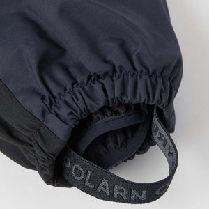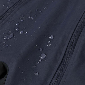 This navy blue kid's puddle suit has lots of technical details to keep kid's dry and warm on outdoor adventures.