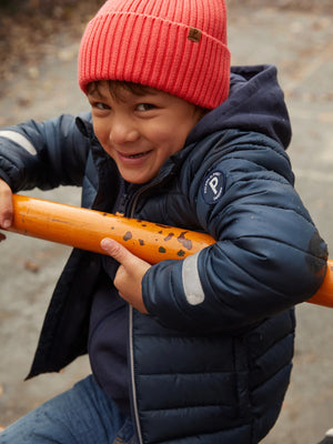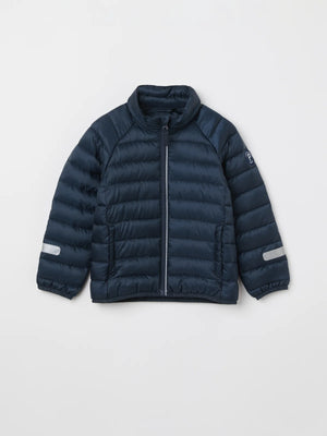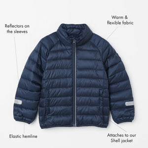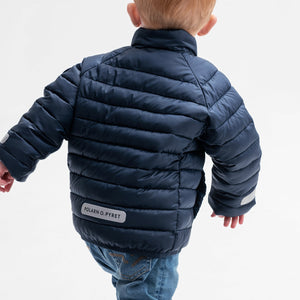 This navy blue kid's puffer jacket offers an excellent warmth-to-weight ratio keeping kids cosy in chilly weather.