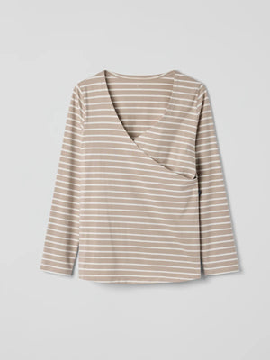 Striped nursing top in soft organic cotton jersey – comfortable during pregnancy and after birth. The top features a V-neckline for easy nursing and an extra fabric layer that keeps the bust covered. Side slits provide a comfy fit, and the top drapes gently around the belly.